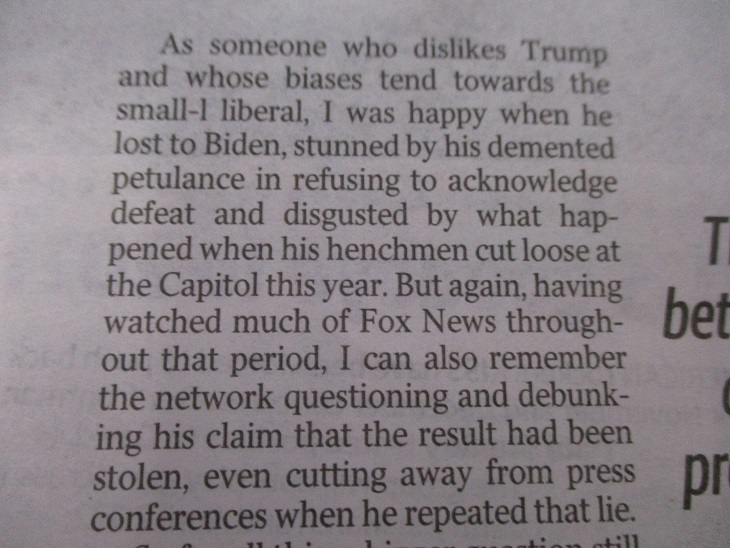 In yesterday's Daily Telegraph former editor David Penberthy threw shade on their ABC's Four Corners program for their two part investigation into Trump's "big lie" that he was robbed in the 2020 election. A key element of that "expose" was about how eeevil Rupert's Fox News aided and abetted the Bad Orange Man in promoting this grand deception.